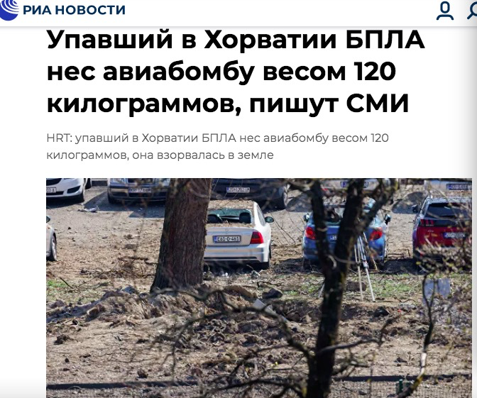 - 外媒:一架苏制无人机在克罗地亚坠毁爆炸 携带重120公斤炸弹 2022-03-14 俄新社报道截图海外网3月14日电 综合俄罗斯卫星通讯社、克罗地亚国家广播电视台(HRT)13日报道,克罗地亚国防部消息人士透露,当地时间3月11日,一架苏联制无...